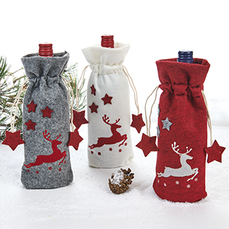 Gift bag f. wine bottle, felt w. reindeer – 30X13CM, 3 ASS.